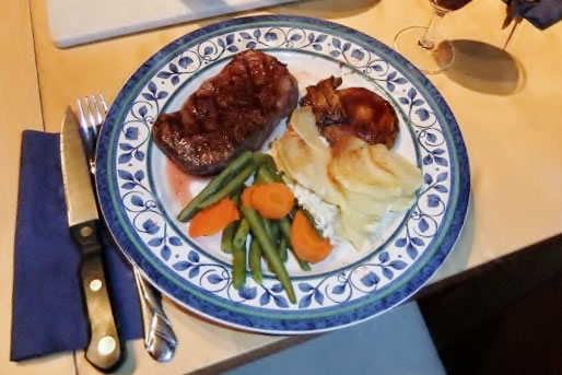 Barbecued steak, mushrooms, carrots, green beans and gratin dauphinois.